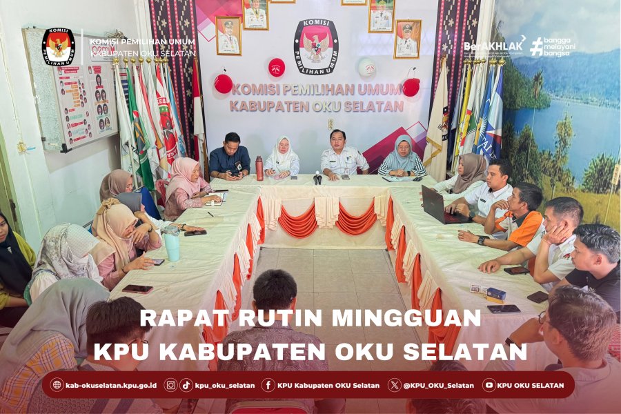 #TemanPemilih KPU Kabupaten OKU Selatan melakukan kegiatan Rapat Rutin Mingguan, bertempat di ruangan Rapat KPU Kabupaten OKU Selatan, Rapat membahas mengenai Evaluasi dan Rencana Kegiatan Mingguan dari masing-masing sub bagian serta evaluasi beberapa tugas tambahan ataupun khusus pasca Pemilu dan Pilkada.