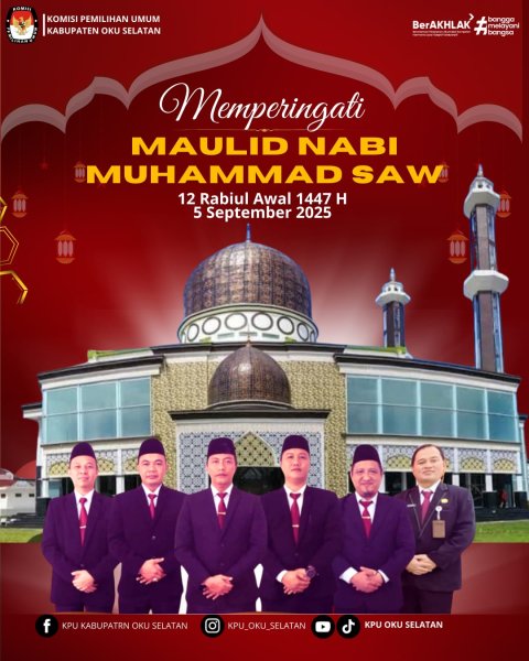 #TemanPemilih Keluarga Besar KPU Kabupaten OKU Selatan mengucapkan selamat memperingati Maulid Nabi Muhammad SAW 1447 H / 2025 M