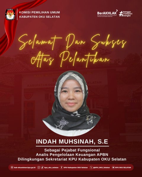 #TemanPemilih Selamat dan Sukses atas pelantikan ibu Indah Muhsinah sebagai Perjabat Fungsional Analis Pengelolaan Keuangan APBN Dilingkungan Sekretariat KPU Kabupaten OKU Selatan. Semoga selalu diberikan kemudahan, kesuksesan dalam menjalankan amanah.
