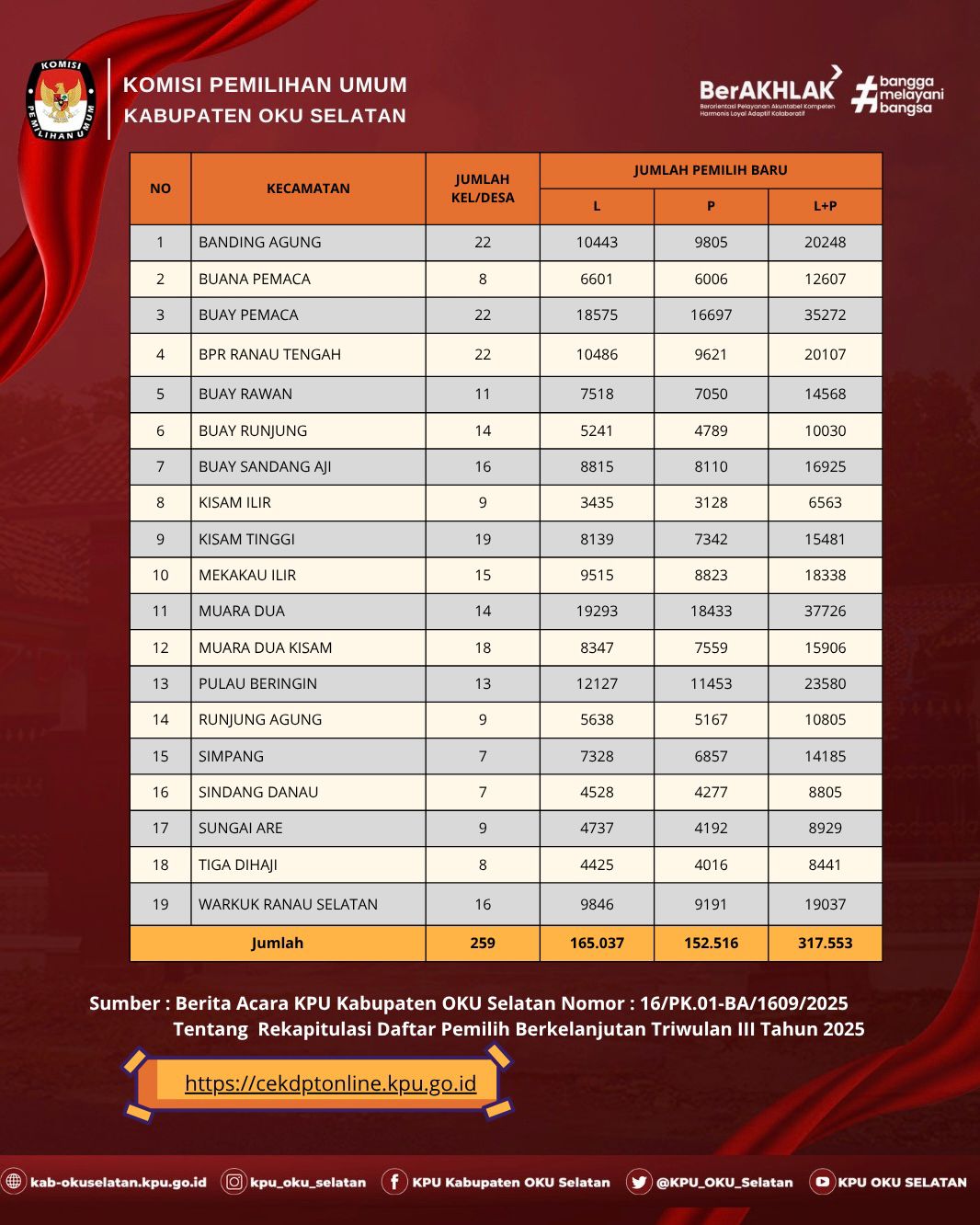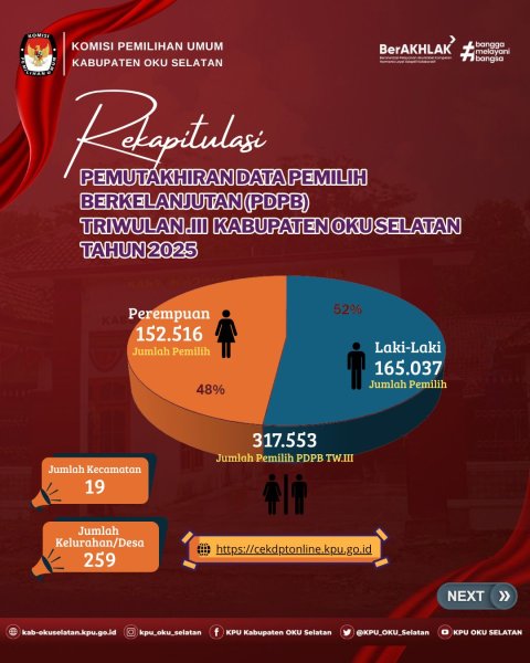 #Temanpemilih berikut Repkapitulasi Pemutakhiran Data Pemilih Berkelanjutan (PDPB) Triwulan III Kabupaten OKU Selatan tahun 2025 berdasarkan Berita Acara Rekapitulasi PDPB KPU Kabupaten OKU Selatan