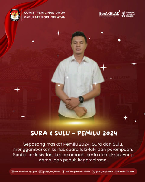 Sepasang maskot Pemilu 2024, Sura dan Sulu, menggambarkan kertas suara laki-laki dan perempuan. Simbol inklusivitas, kebersamaan, serta demokrasi yang damai dan penuh kegembiraan.