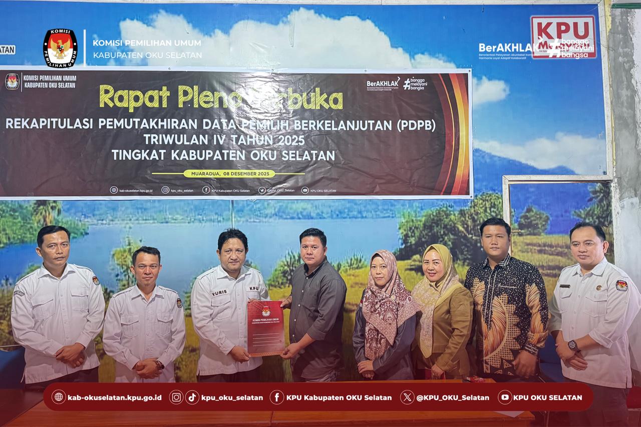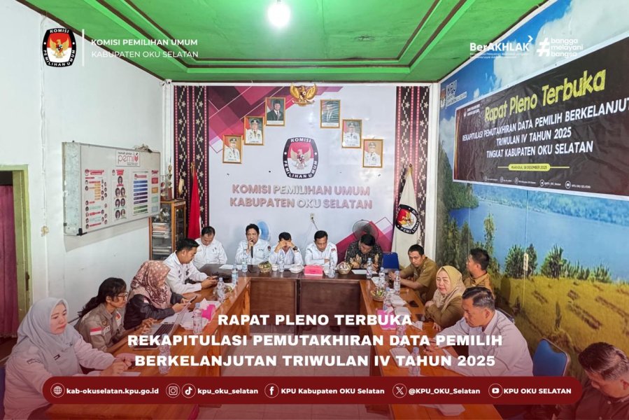 #TemanPemilih KPU Kabupaten OKU Selatan hari ini melaksanakan Rapat Pleno Terbuka Rekapitulasi Pemutakhiran Data Pemilih Berkelanjutan (PDPB) Triwulan IV Tahun 2025 di Kantor KPU OKU Selatan. Kegiatan ini menjadi bagian penting dalam memastikan data pemilih selalu akurat, mutakhir, dan sesuai dengan kondisi masyarakat di lapangan.