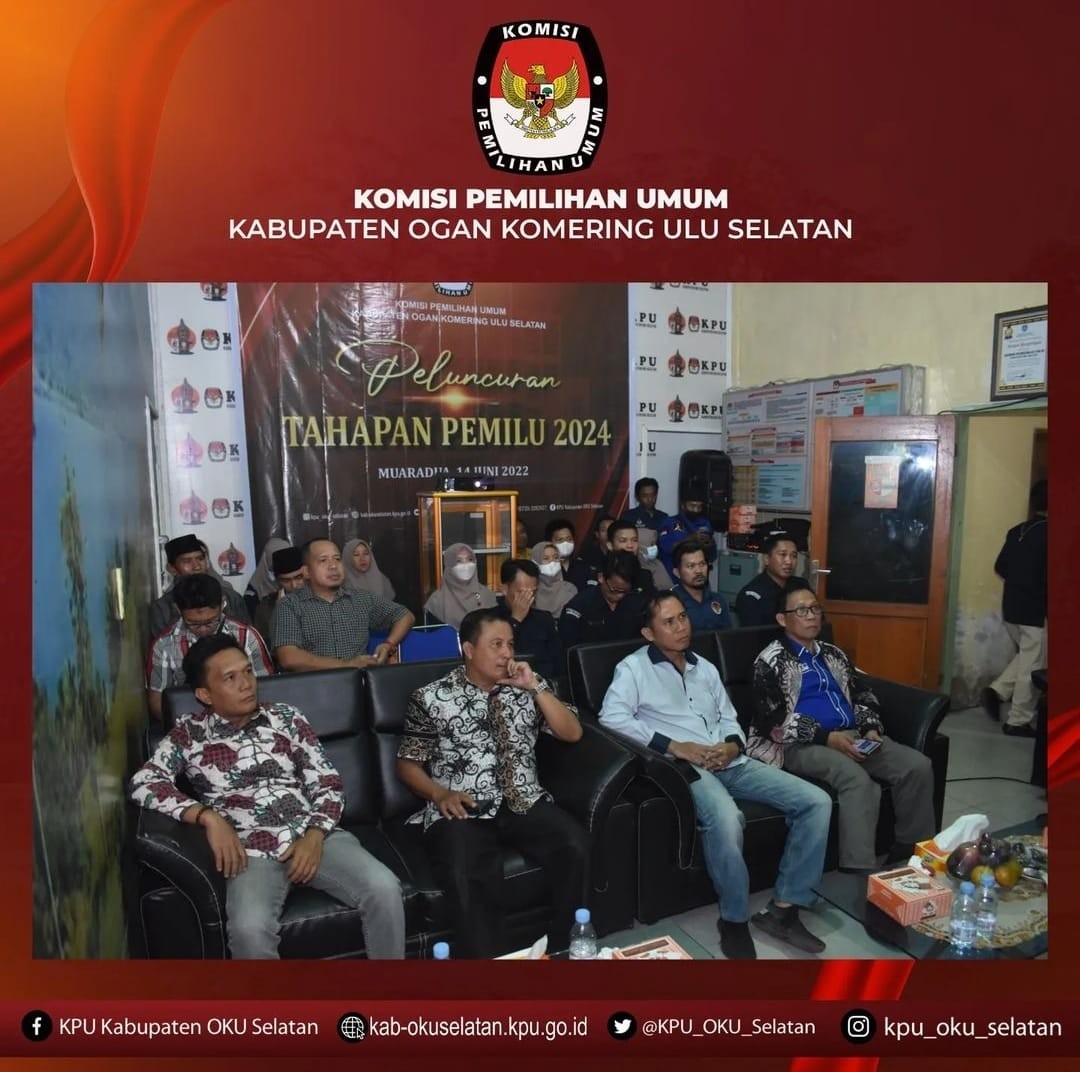 Selasa, 14 Juni 2022 Pukul 19.00 KPU OKU Selatan mengadakan kegiatan nonton bareng Peluncuran Tahapan Pemilu 2024 melalui zoom meeting di Ruang Rapat Kantor KPU OKU Selatan, kegiatan juga dihadiri oleh perwakilan pemerintah daerah, Pemangku Kepentingan dan Partai Politik di Kabupaten OKU Selatan