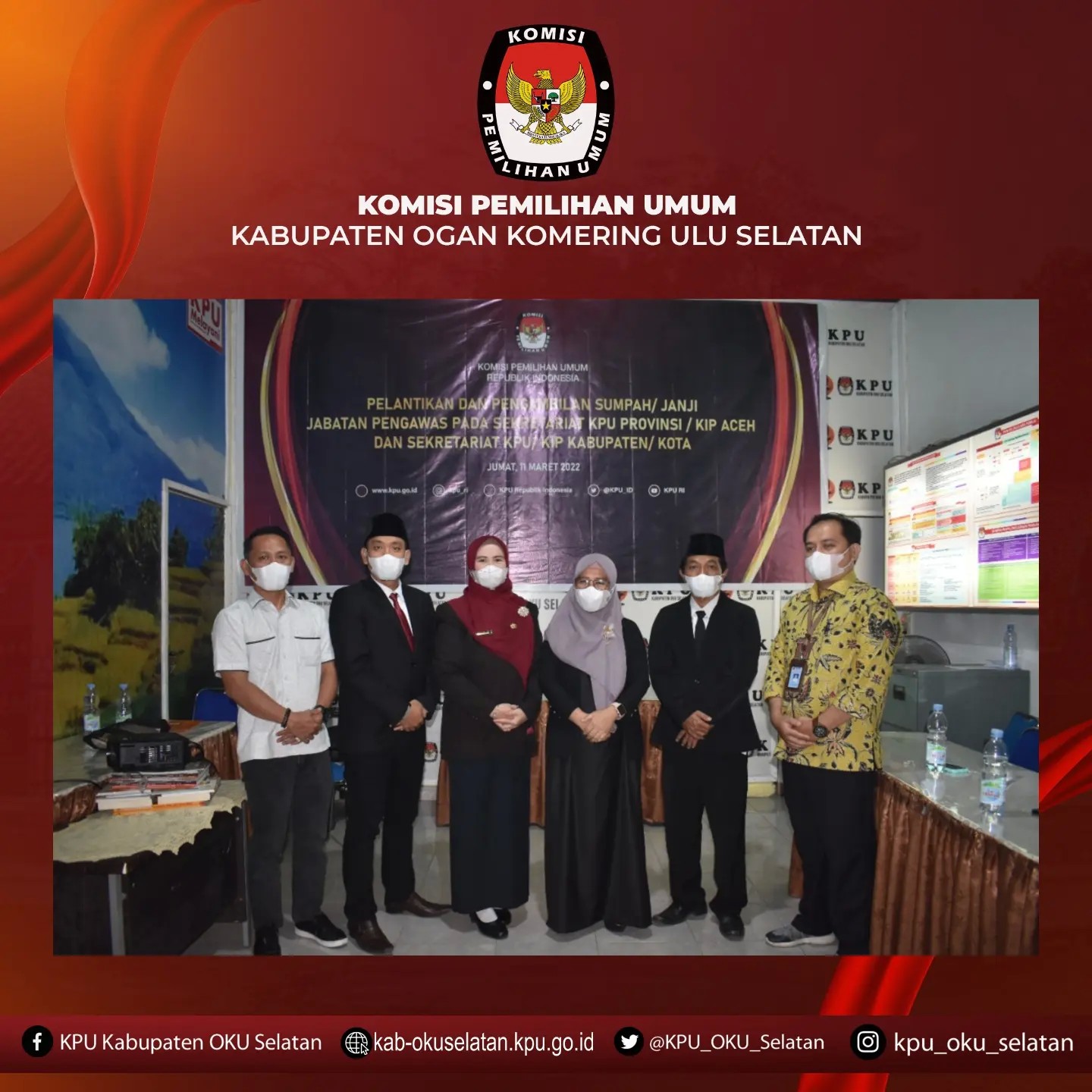 KPU OKU Selatan mengikuti Pelantikan dan Pengambilan Sumpah Janji Jabatan Pengawas Pada KPU Kabupaten/Kota dan Provinsi Se Sumatera Selatan. Pada kesempatan ini kegiatan turut dihadiri oleh Ketua dan Sekretaris KPU OKU Selatan, Kegiatan dilaksanakan secara daring melalui aplikasi Zoom Meeting di ruangan rapat kantor KPU OKU Selatan