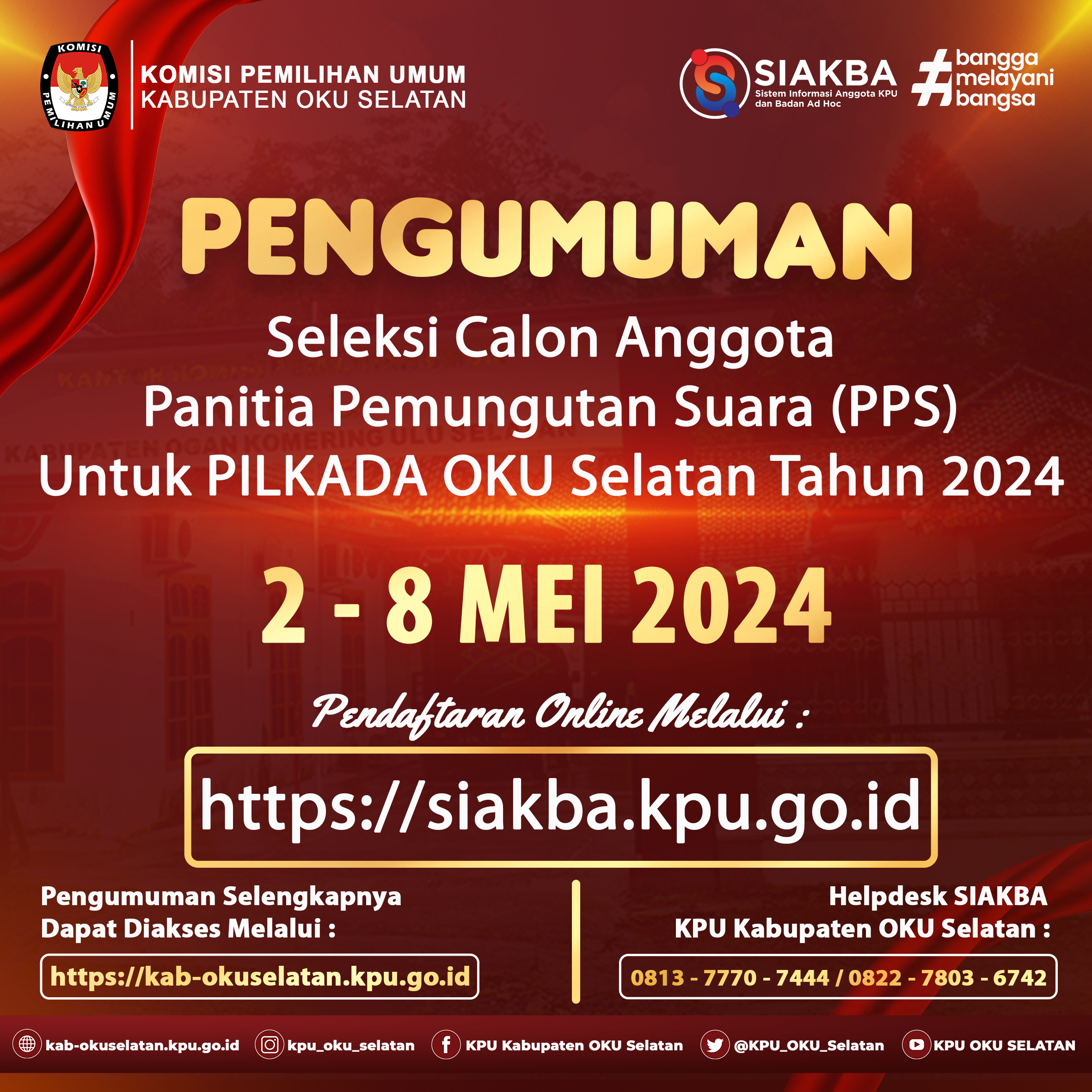 #TemanPemilih KPU OKU Selatan mengundang Bapak dan Ibu Warga Negara Republik Indonesia yang memenuhi Kualifikasi untuk menjadi bagian dalam penyelenggaraan Pilkada Serentak Tahun 2024 Sebagai Panitia Pemungutan Suara (PPS) untuk Pemilihan Gubernur dan Wakil Gubernur Sumatera Selatan, Bupati dan Wakil Bupati Ogan Komering Ulu Selatan Tahun 2024.
