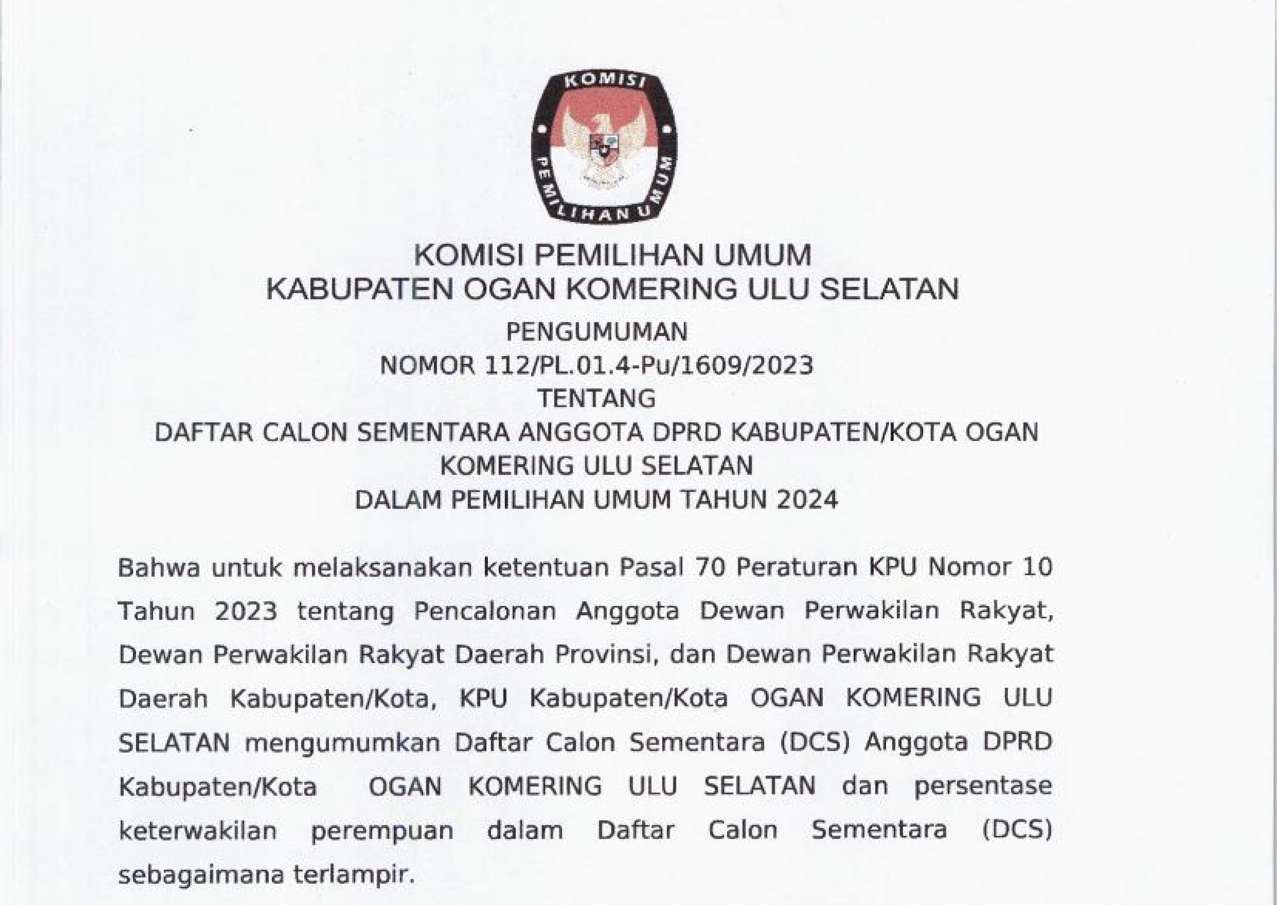 PENGUMUMAN DAFTAR CALON SEMENTARA ANGGOTA DPRD KABUPATE OGAN KOMERING ULU SELATAN UNTUK PEMILU TAHUN 2024
