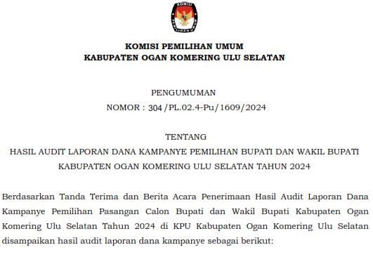 PENGUMUMAN HASIL AUDIT LAPORAN DANA KAMPANYE PEMILIHAN BUPATI DAN WAKIL BUPATI OKU SELATAN TAHUN 2024