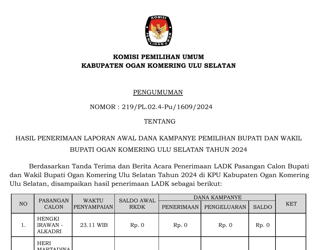 PENGUMUMAN HASIL HASIL PENERIMAAN LAPORAN AWAL DANA KAMPANYE PEMILIHAN BUPATI DAN WAKIL BUPATI OKU SELATAN TAHUN 2024
