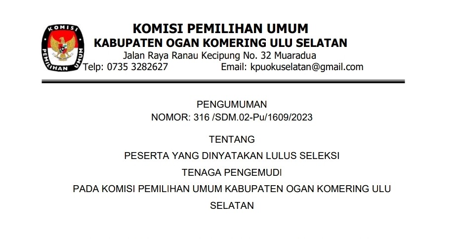 PENGUMUMAN HASIL KELULUSAN SELEKSI TENAGA PENGEMUDI KPU KABUPATEN OGAN KOMERING ULU SELATAN TAHUN 2023