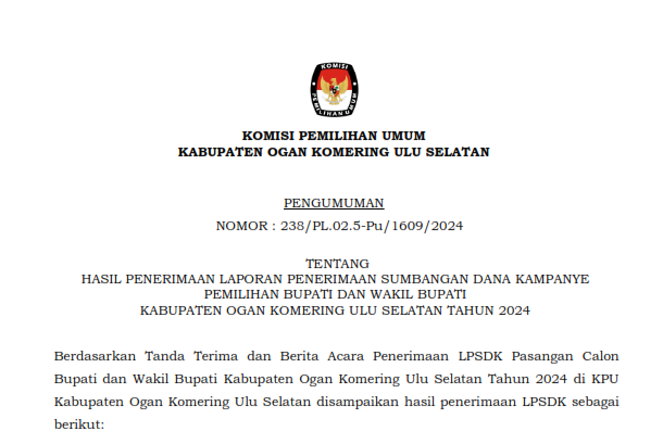 PENGUMUMAN HASIL PENERIMAAN LAPORAN PENERIMAAN SUMBANGAN DANA KAMPANYE PEMILIHAN BUPATI DAN WAKIL BUPATI KABUPATEN OGAN KOMERING ULU SELATAN TAHUN 2024