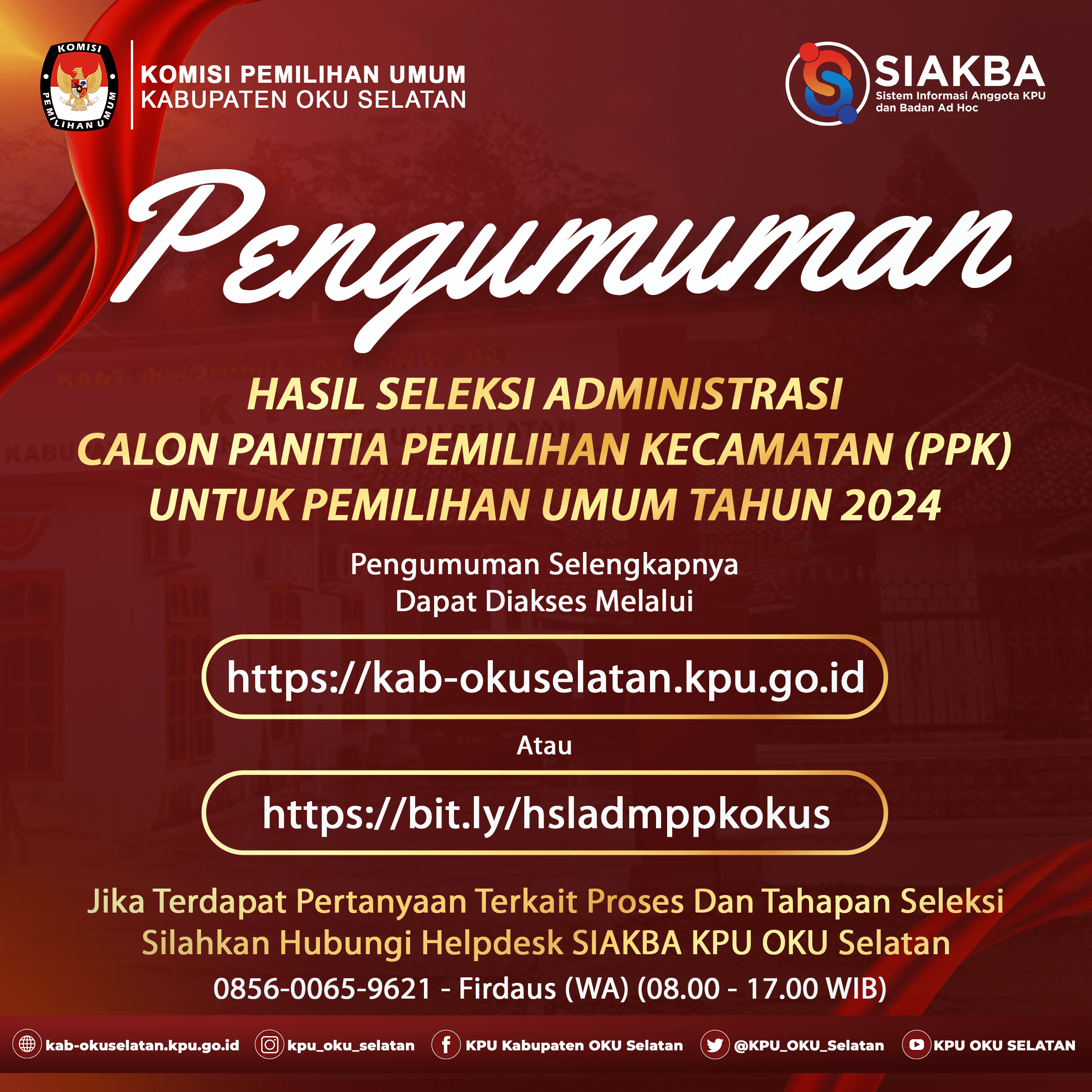 #TemanPemilih Berikut kami sampaikan Pengumuman Hasil Seleksi Administrasi Panitia Pemilihan Kecamatan (PPK) untuk Pemilu Tahun 2024.