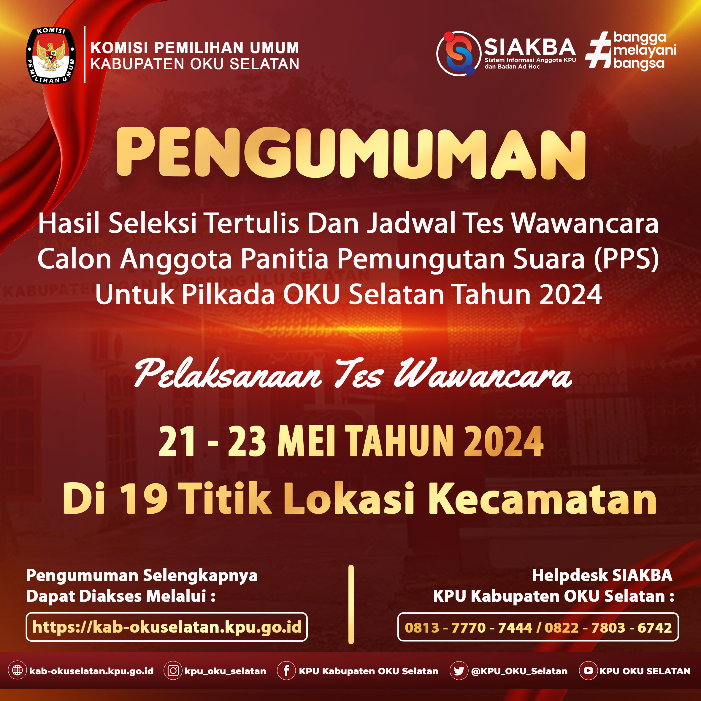 #TemanPemilih Berikut kami sampaikan Pengumuman Hasil Seleksi Tertulis dan Jadwal Wawancara Panitia Pemungutan Suara (PPS) Untuk Pemilihan Gubernur dan Wakil Gubernur Sumatera Selatan serta Bupati dan Wakil Bupati Ogan Komering Ulu Selatan Tahun 2024.
