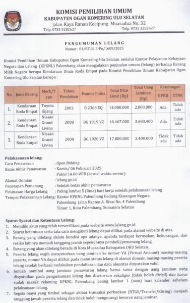 #TemanPemilih Berikut kami sampaikan Pengumuman Lelang Barang Milik Negara (BMN) Berupa Kendaraan Dinas Roda Empat oleh KPU Kabupaten OKU Selatan Tahun 2025.