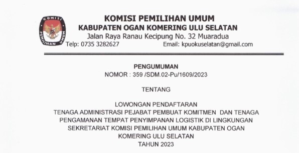 PENGUMUMAN LOWONGAN PENDAFTARAN TENAGA ADMINISTRASI PEJABAT PEMBUAT KOMITMEN DAN TENAGA KEAMANAN TEMPAT PENYIMPANAN LOGISTIK DI LINGKUNGAN SEKRETARIAT KPU OKU SELATAN TAHUN 2023