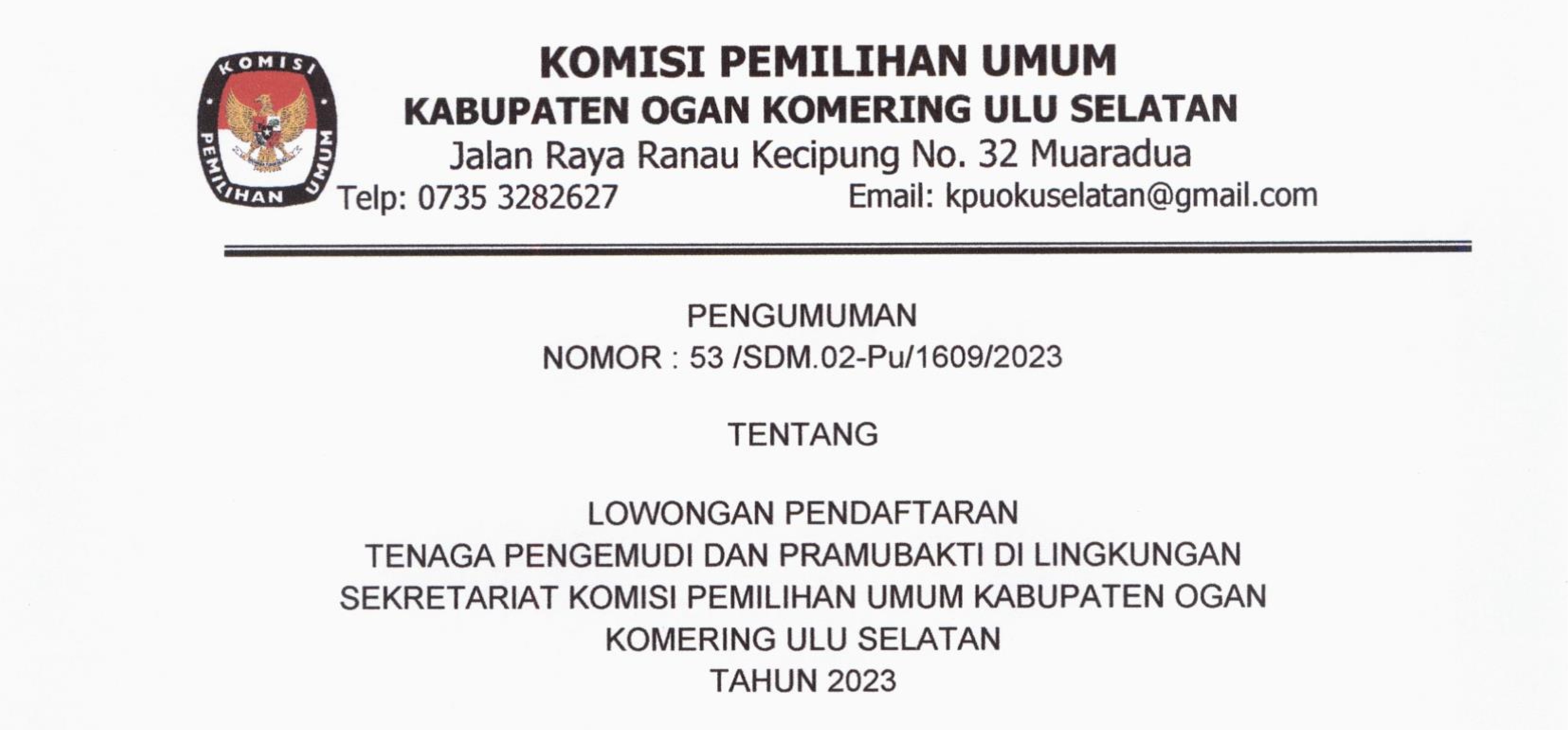 PENGUMUMAN LOWONGAN PENDAFTARAN TENAGA PENGEMUDI DAN PRAMUBAKTI DI LINGKUNGAN SEKRETARIAT KOMISI PEMILIHAN UMUM KABUPATEN OGAN KOMERING ULU SELATAN TAHUN 2023