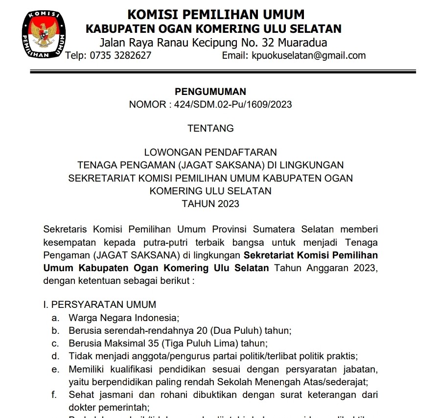 PENGUMUMAN LOWONGAN TENAGA KEAMANAN (JAGAT SAKSANA) KPU KABUPATEN OKU SELATAN