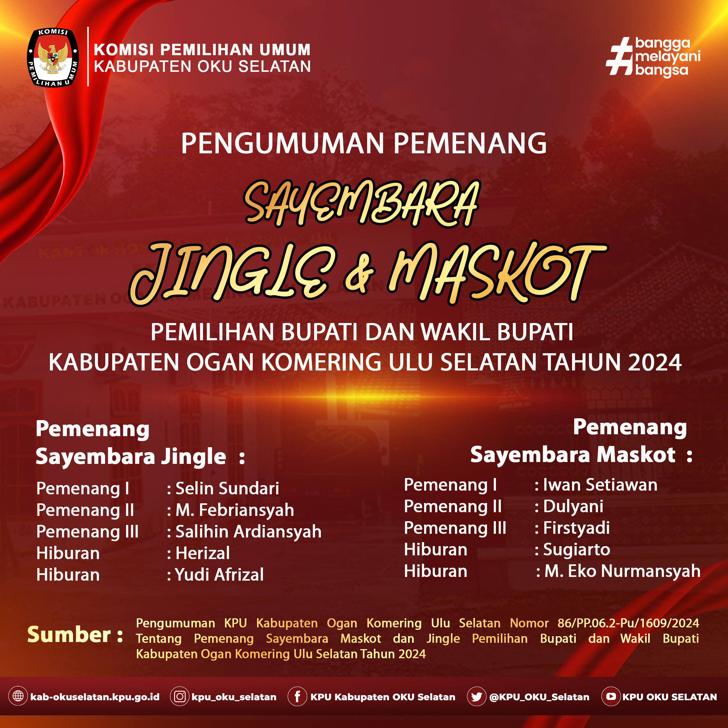 PENGUMUMAN PEMENANG SAYEMBARA JINGLE DAN MASKOT PEMILIHAN BUPATI DAN WAKIL BUPATI OKU SELATAN TAHUN 2024