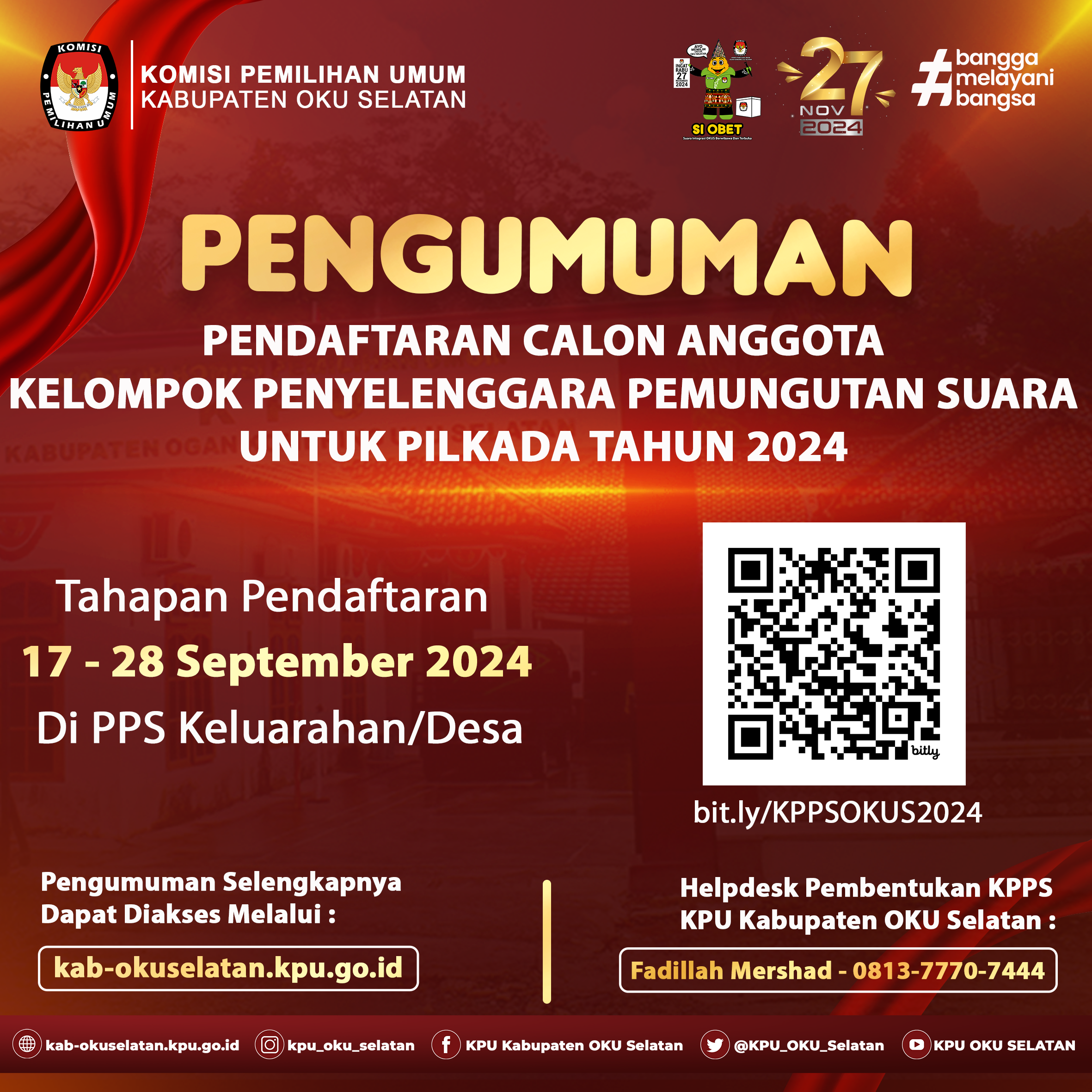 #TemanPemilih Komisi Pemilihan Umum Kabupaten Ogan Komering Ulu Selatan telah membuka Pendaftaran Calon Anggota Kelompok Penyelenggara Pemungutan Suara (KPPS) Untuk Pilkada Serentak Tahun 2024. Pengumuman Selengkapnya dapat di lihat pada link berikut :