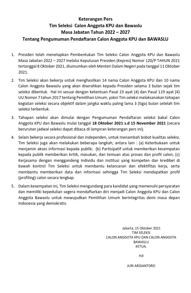 PENGUMUMAN PENDAFTARAN CALON ANGGOTA KPU RI DAN BAWASLU RI PERIODE 2022 - 2027