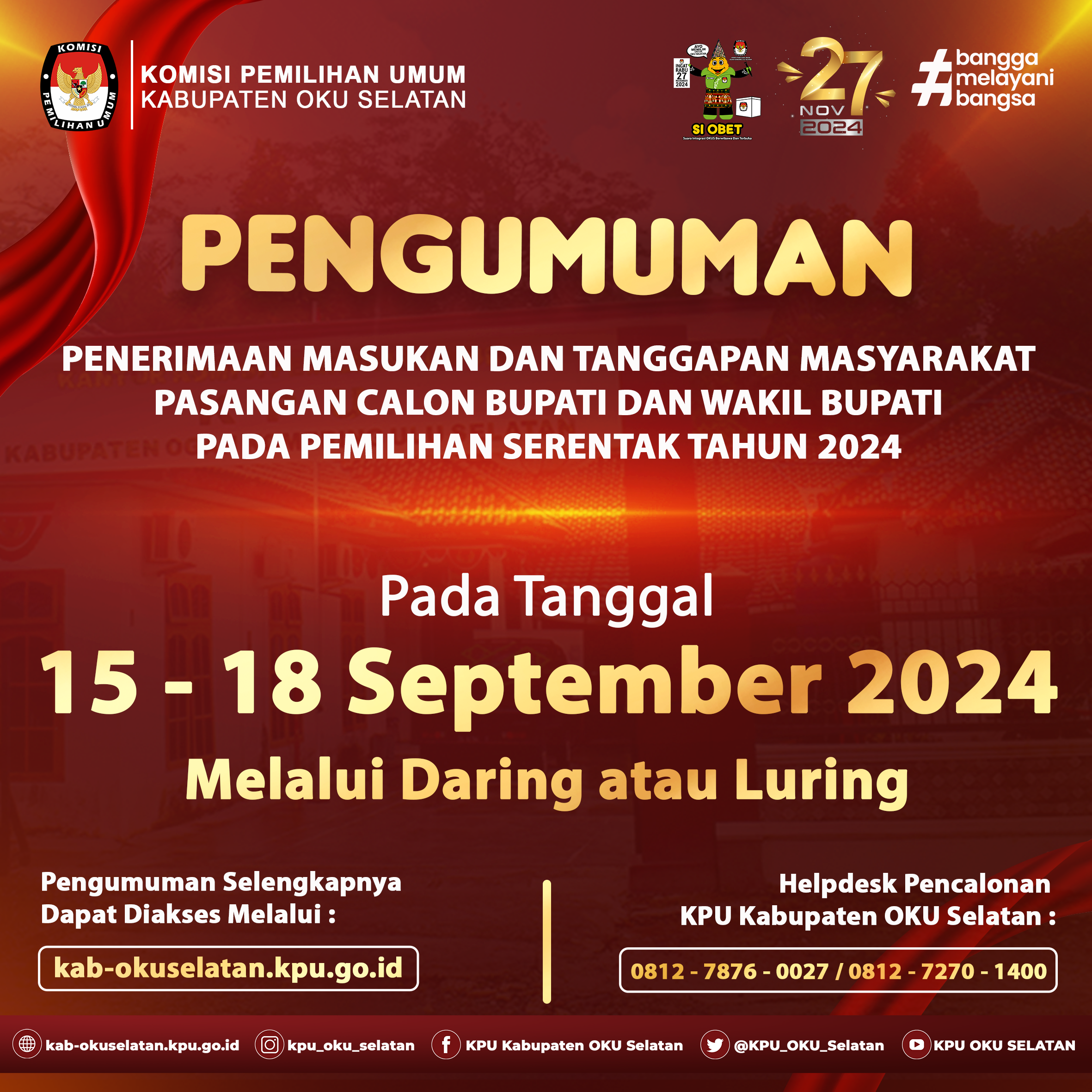 PENGUMUMAN PENERIMAAN MASUKAN DAN TANGGAPAN MASYARAKAT TERHADAP PASANGAN CALON BUPATI DAN WAKIL BUPATI OKU SELATAN TAHUN 2024
