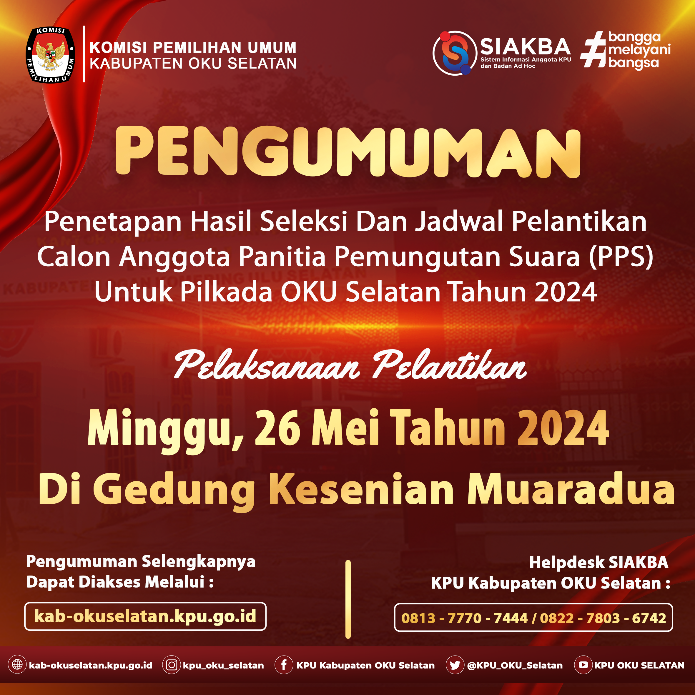 PENGUMUMAN PENETAPAN HASIL SELEKSI DAN JADWAL PELANTIKAN CALON ANGGOTA PANITIA PEMUNGUTAN SUARA (PPS) PADA PILKADA OKU SELATAN TAHUN 2024