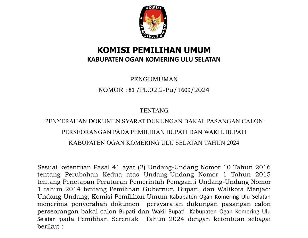 #TemanPemilih Berikut kami sampaikan Pengumuman Penyerahan Dokumen Syarat Dukungan Perseorangan Pada Pemilihan Bupati dan Wakil Bupati Ogan Komering Ulu Selatan Tahun 2024.