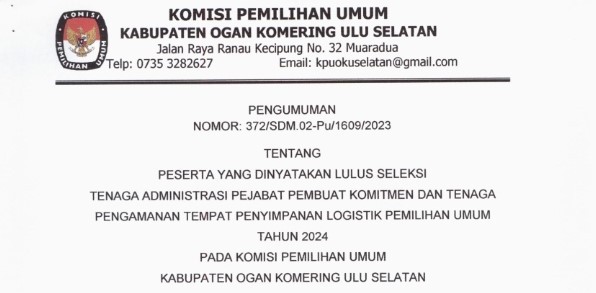 PENGUMUMAN PESERTA YANG DINYATAKAN LULUS TENAGA ADMINISTRASI PPK DAN PENGAMANAN TEMPAT PENYIMPANAN LOGISTIK KPU KABUPATEN OKU SELATAN