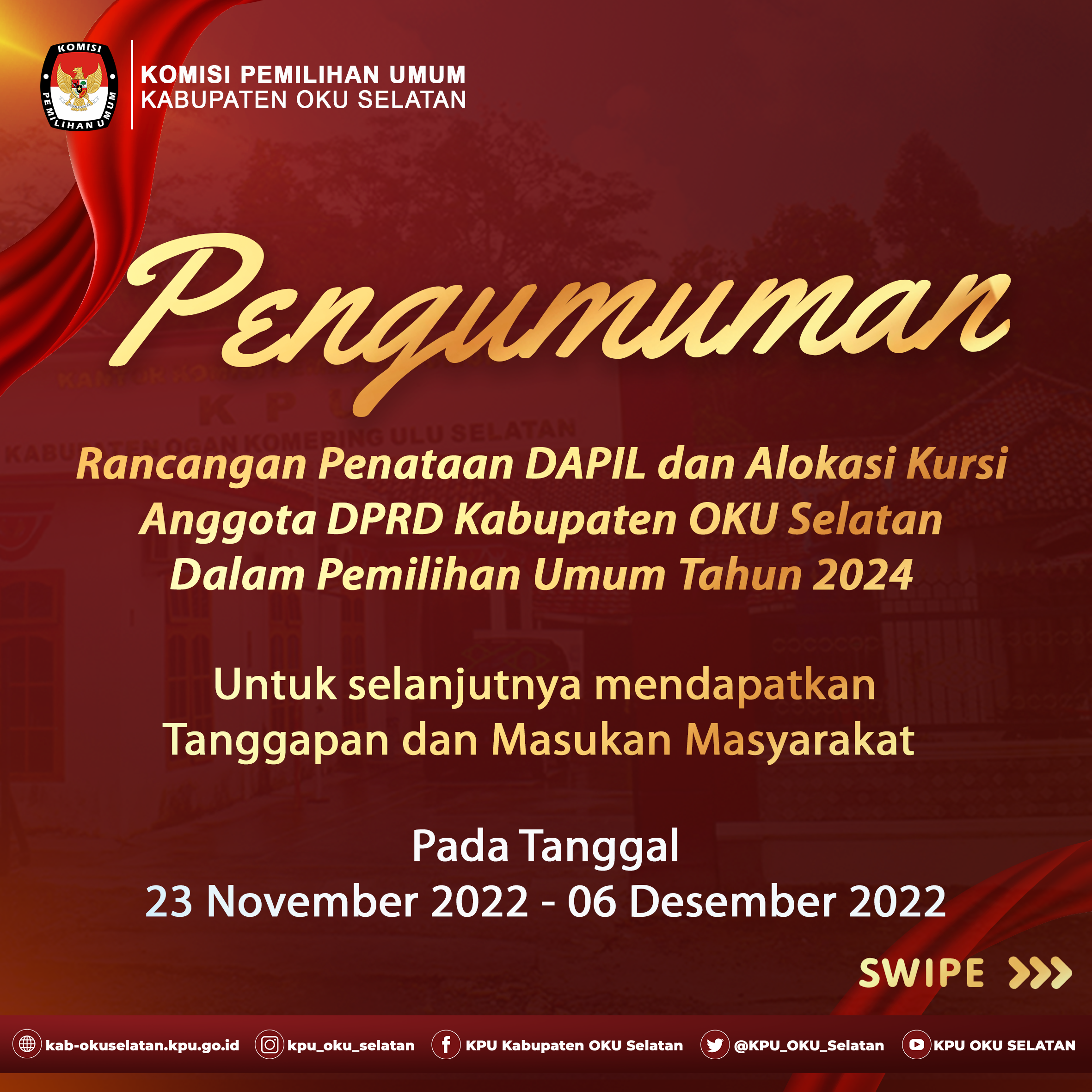 #TemanPemilih Berikut kami sampaikan Pengumuman Rancangan Penataan Daerah Pemilihan dan Alokasi Kursi Anggota DPRD Kabupaten OKU Selatan Dalam Pemilu Tahun 2024. Selanjutnya #TemanPemilih dapat memberikan masukan dan tanggapan masyarakat terkait Rancangan Penataaan Daerah Pemilihan dan Alokasi Kursi yang di susun oleh KPU OKU Selatan dengan ketentuan yang ada pada pengumuman di bawah ini.