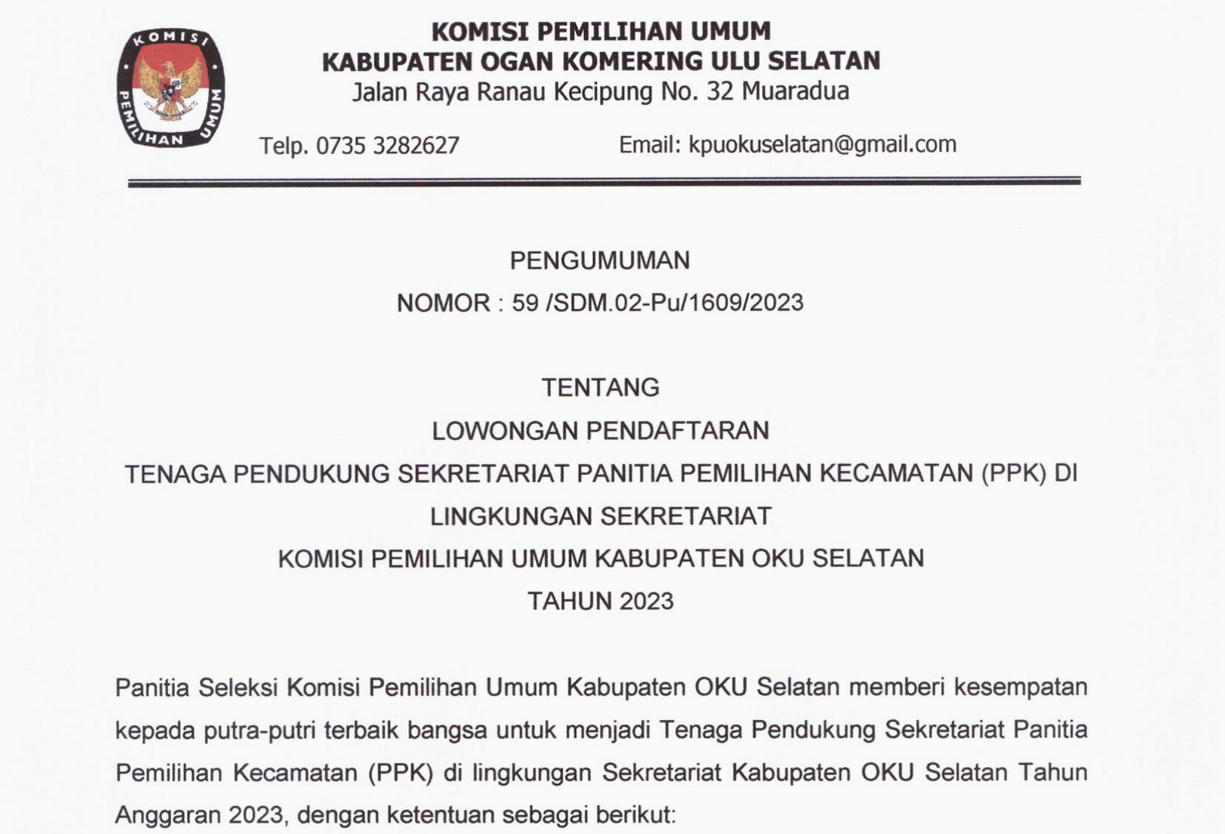 PENGUMUMAN REKRUTMEN TENAGA PENDUKUNG PANITIA PEMILIHAN KECAMATAN (PPK) UNTUK PEMILU TAHUN 2024