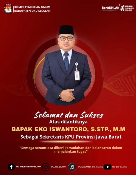 #TemanPemilih Seluruh jajaran KPU Kabupaten OKU Selatan mengucapkan Selamat dan Sukses atas dilantiknya Bapak Eko Iswantoro, S.STP., M.M sebagai Sekretaris KPU Provinsi Jawa Barat.