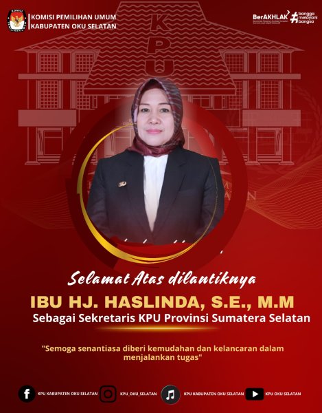 #TemanPemilih Seluruh jajaran KPU Kabupaten OKU Selatan mengucapkan Selamat atas dilantiknya ibu Hj. Haslinda, S.E,. M.M sebagai Sekretaris KPU Provinsi Sumatera Selatan