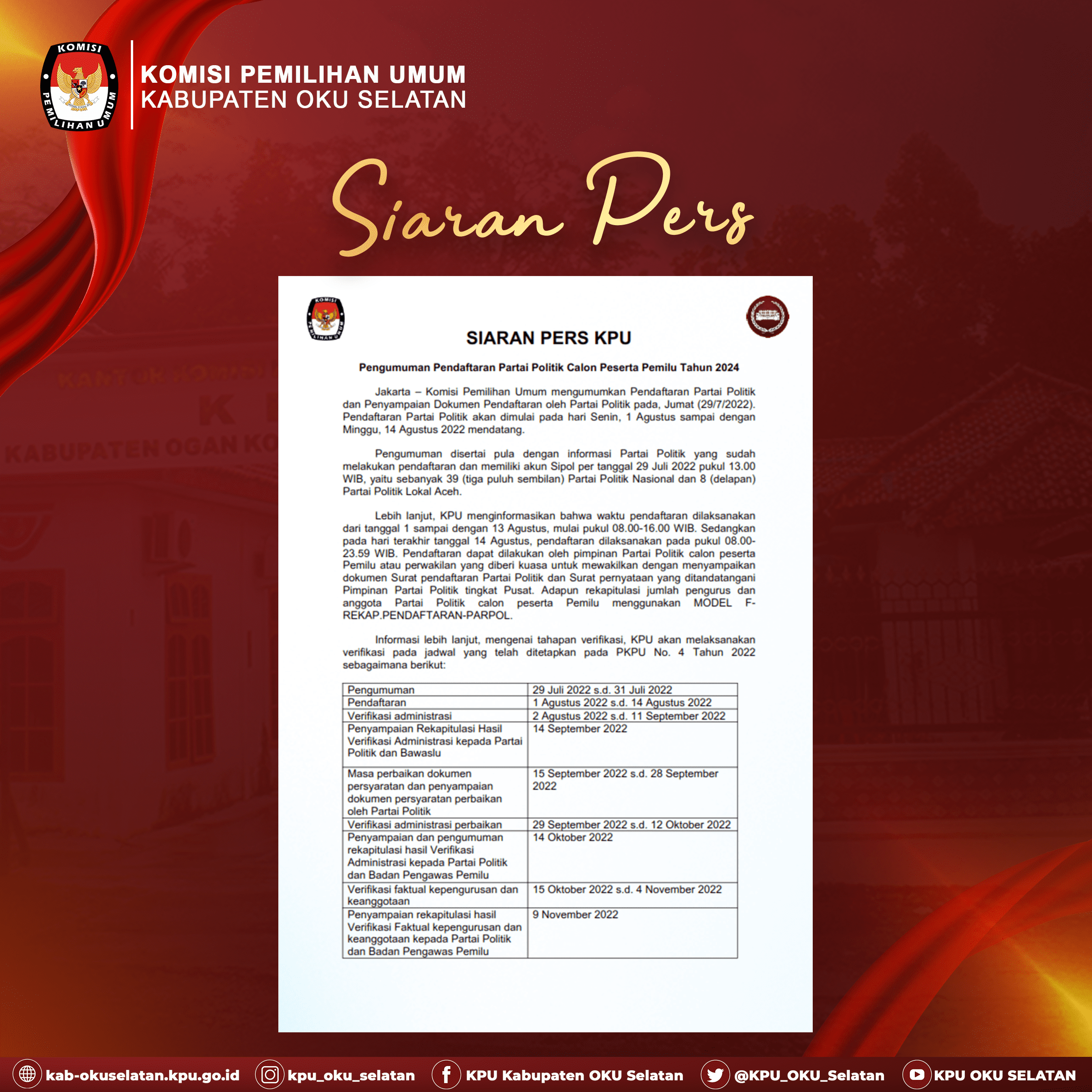 #TemanPemilih Berikut disampaikan Siaran Pers KPU Republik Indonesia Mengenai Pendaftaran, Verifikasi dan Penetapan Partai Politik Peserta Pemilu 2024, Yang mana pada saat ini telah masuk pada tahap pengumuman.