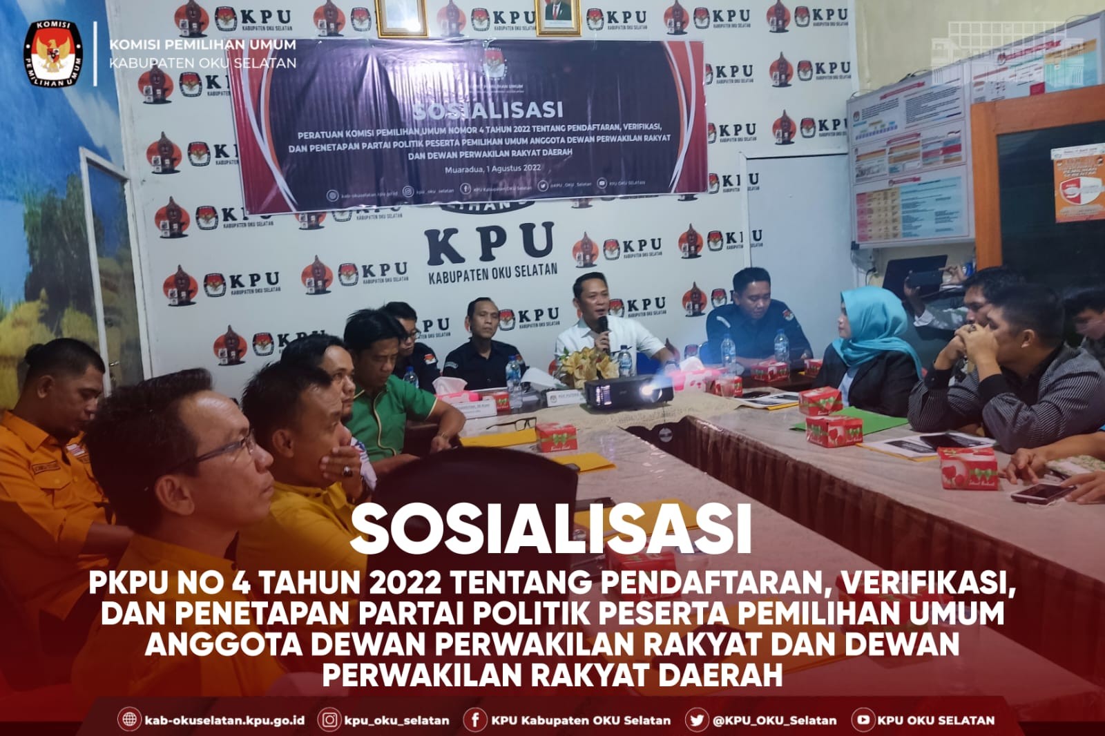 #TemanPemilih KPU OKU Selatan Mengadakan Sosialisasi PKPU No 4 Tahun 2022 tentang Pendaftaran, Verifikasi, dan Penetapan Partai Politik Peserta Pemilihan Umum Anggota Dewan Perwakilan Rakyat dan Dewan Perwakilan Rakyat Daerah di ruangan rapat kantor KPU OKU Selatan. Kegiatan dihadiri oleh Ketua dan Anggota KPU OKU Selatan, Ketua dan Staff BAWASLU OKU Selatan, Perwakilan Kesbangpol OKU Selatan, Kasat Intelkam dan Anggota Polres OKU Selatan, dan Perwakilan Partai Politik di wilayah kabupaten OKU Selatan.